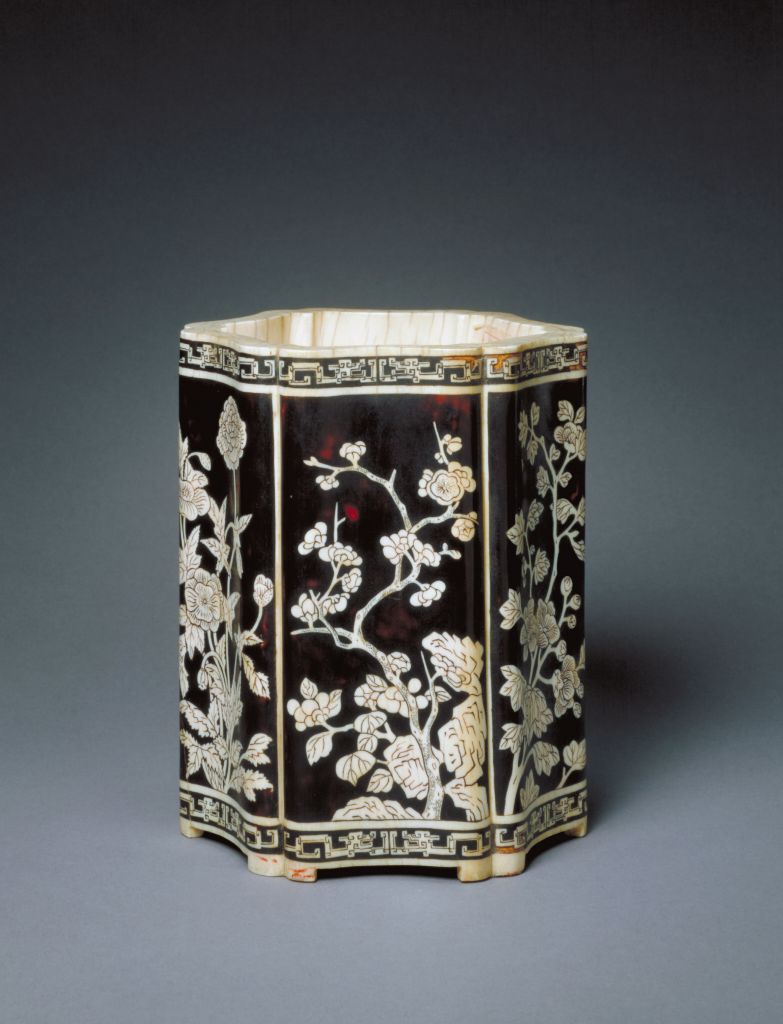 筒身6瓣花式,每一面均微凹入,通体曲线优美。底部6顶角设6矮足。口、足边沿饰变体夔纹,筒身主体纹样则为开光内饰各式折枝花卉,如牡丹、玉兰、菊花、梅花等,图案黑地白章,效果鲜明强烈。
