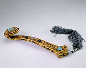 如意金累丝制,通体在钱纹地上饰云凤纹及寿字。如意首隆起成三台,中央嵌松石,柄嵌蓝宝石、碧玺,柄身两侧又以宝石嵌杂宝纹,朵状尾部亦嵌松石。金累丝纹饰上饰点翠,现多已脱落。
