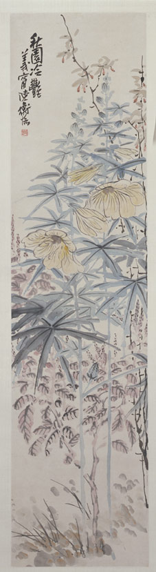 图中绘秋葵、雁来红等秋季花卉。本图较为注重色彩的搭配运用,鲜黄色的秋葵花配以花青色的枝叶,成为画面的中心。下方穿插雁来红,设色浅淡,整体色彩淡雅和谐。陈师曾的花鸟画虽然受吴昌硕影响较大,但他同时博习诸家,尤为注重写生,此图即明显带有对景写生的痕迹,给人以清新自然之感。