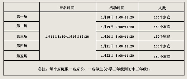 1.本期五场活动内容一致,选择一场参加即可,请各位家长和学生根据情况安排参加活动时间,请不要重复报名。每场活动名额有限,额满为止。