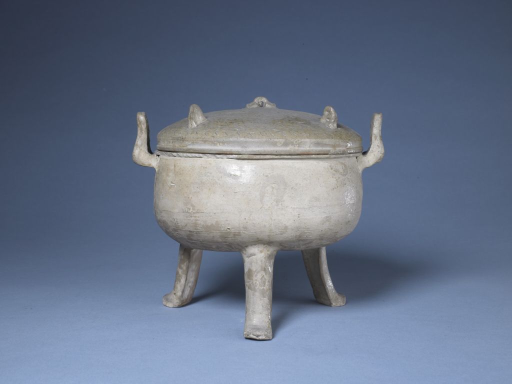 鼎仿同时期青铜器造型,口沿下对称置双耳。直腹,平底,下承以外撇三足。器表施青釉,胎色灰白。鼎附圆形盖,盖顶中央置一小系,四周对称分布三个小纽。盖面施青釉,以三道弦纹为装饰带,其间刻划简单的水波纹。