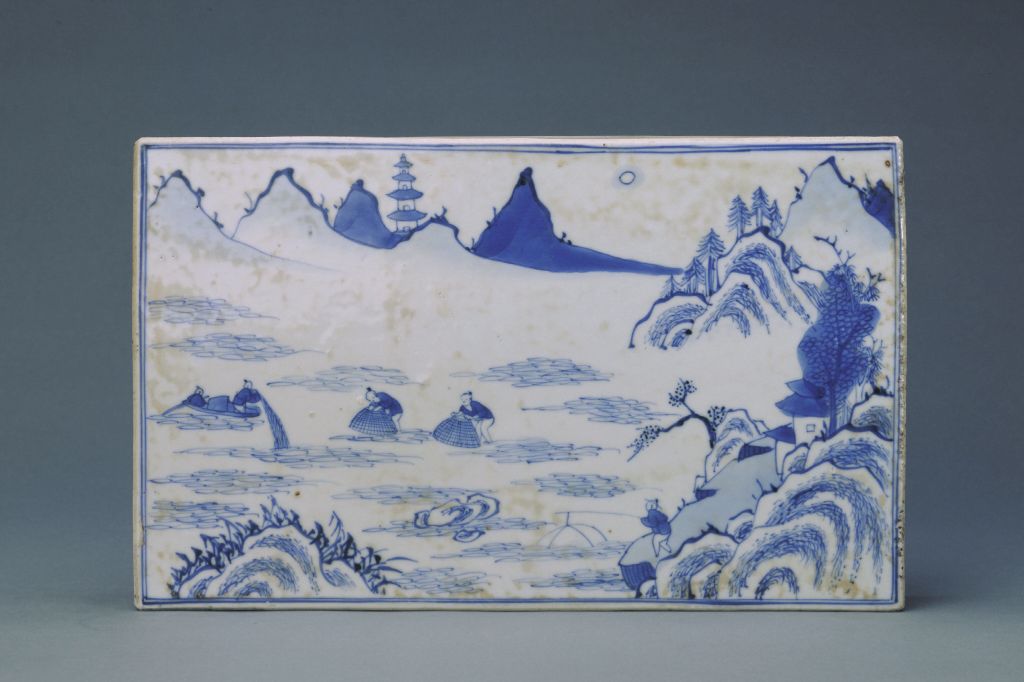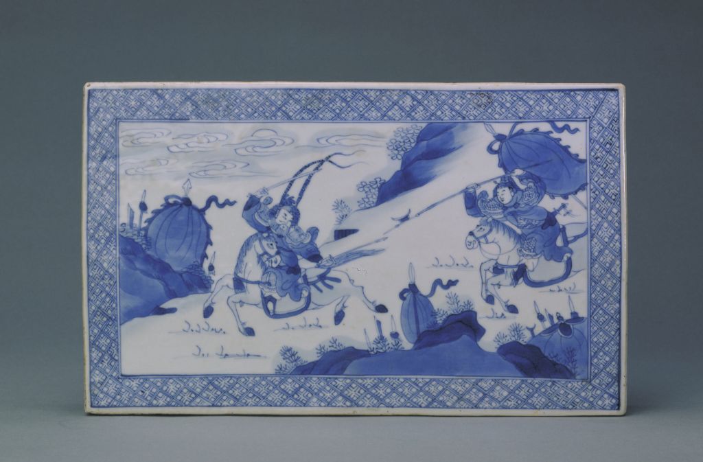 青花人物图长方瓷板,清康熙,长27.2厘米,宽17厘米,高4.2厘米。