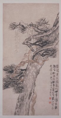 雍正八年即1730年,李鱓时年45岁。是年八月,他得到第二次进入宫廷的机会,但他并未因讨统治者欢心而一味摹古,从事工整严谨的绘画,而是以自己的绘画理想放笔写意。十月,他创作了这幅《松藤图》。画面上,苍老的松干上缠绕褚色藤萝,构图讲究,设色淡雅,用笔苍劲,泼墨淋漓,随意点染,却不零乱,很有整体感。尤其擅于用水,画面象刚画完时一样湿润清新。是李鱓写意画的代表作,体现了他以抒发性情为个性的画风。