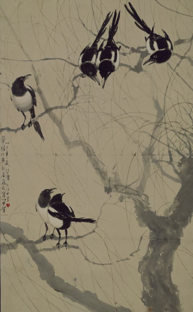 1944年,徐悲鸿因患高血压与肾炎在重庆住医院半年,医嘱不得动笔做画。因此,这一年其创作数量锐减。本幅是他在年初应朋友之邀所绘,十分难得。图绘在春风杨柳万千条的新春时节,刚刚泛绿的柳树枝头,高低错落地栖息着六只喜鹊,其中两只紧紧相依,窃窃私语,引得其他鹊儿驻足观望。