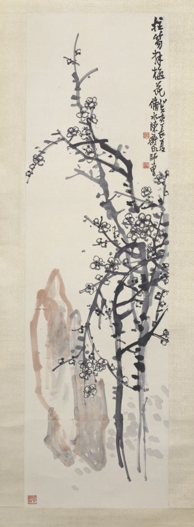 图中以墨笔圈花法画梅花,画石则全用浅绛色。梅与石相互衬托,使梅花的峭拔与石块的朴拙对比得格外鲜明。构图别出新意,行笔颇见力度。