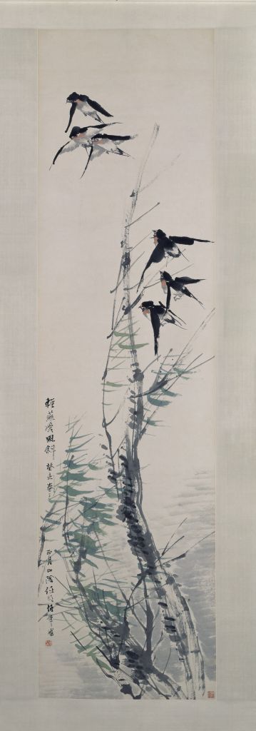 《风柳群燕图》轴,清光绪九年(1883年),任颐绘,绢本,设色,纵152.5厘米,横40厘米。