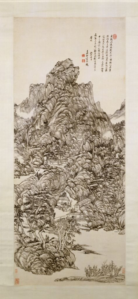 图绘重峦叠嶂,流泉飞瀑,为画家心目中的理想仙境。作者虽云仿自元人黄鹤山樵,即王蒙,实际上是作者集古人大成之作。图中不仅有王蒙细密的笔墨,还有五代董源和巨然气势雄伟、于严整中求变化的构图,明董其昌所提倡的书卷之气亦迷漫于清疏秀逸的意境中。此图表现出作者成熟期的山水画风貌和深厚的传统笔墨功底。