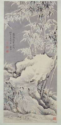 图绘湖石耸立,秀竹盈雪,寒草委地,意境萧散。淡墨染就阴沉天气,冬日清冷跃然纸端。画石以染代皴,尤富质感,写竹则行笔快捷,浓淡相映,妙趣横生。古人常藉兰竹以寓文人高洁脱俗的性格,此图借幽篁凌寒傲雪之姿,将其耐寒燠、抗冰雪的坚贞性格刻画得淋漓尽致,堪为佳作。