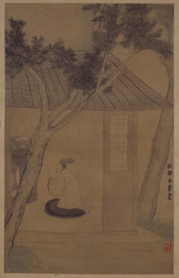 图绘室内一居士长跪蒲团上,双手合十,前方圆案上供佛像、香炉、经册,屋外双树围绕。人物衣纹用线简劲流畅而略显虬曲,屋舍及屋外双树用笔朴拙厚重,体现了金石笔意。礼佛图是宋元以来比较常见的题材,不同于蕃王礼佛、龙王礼佛等宗教意涵较强的题材,居士礼佛更注重个人的宗教和情感体验。金农晚年静心事佛,该图融入了他个人的宗教体验和情感,生拙的笔意、富有的层次水墨与虔诚的情感相交融,使全画体现出静谧的禅意。