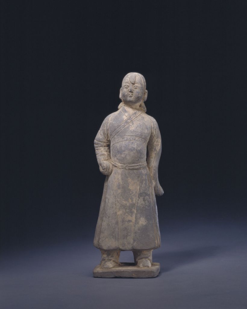 陶俑面形饱满。穿斜襟长衫,腰系带。右手握于腰间,立于长方形踏板上。