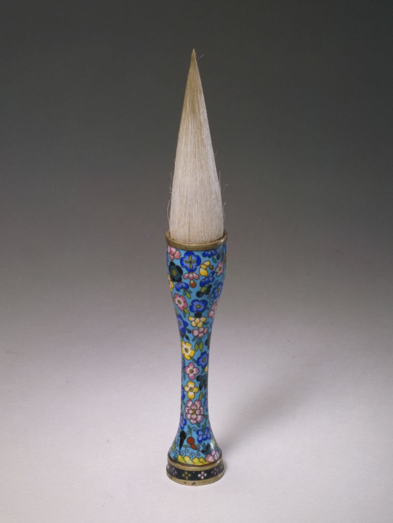 笔头为羊毫长锋。笔管为铜胎掐丝珐琅管,饰花卉图案,浅蓝的底色上点染着白、黑、粉诸种珐琅釉色。图案的设计与釉色的应用显现出清代晚期民间珐琅工艺的风格。