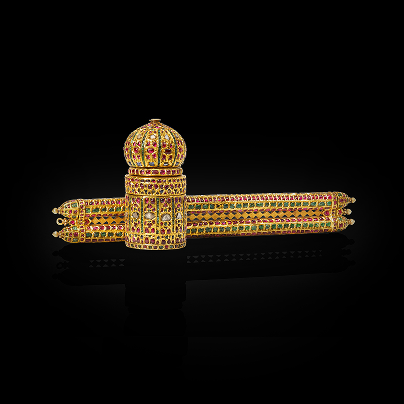 这件富丽堂皇的藏品是现存的唯一镶嵌宝石的御用金质笔盒和墨水瓶(davit-i daulat)。器表嵌满宝石,小巧爪镶和尖头玫瑰花饰起着加固宝石的作用,镶嵌式样精巧别致,特色十足。君王向最高级的朝臣颁赐缀满珠宝的笔盒和墨水瓶,以此为最高殊荣的象征,这是在奥朗则布皇帝统治时期颇为流行的做法。笔盒的形制以自16世纪初期的伊朗造型为蓝本;此外,在本例中,墨水瓶的底面还以象征求知的圣鸟桓娑(hamsa)为装饰。桓娑还是印度教文学和诗歌女神萨拉斯瓦蒂(Sarasvati)的坐骑。
