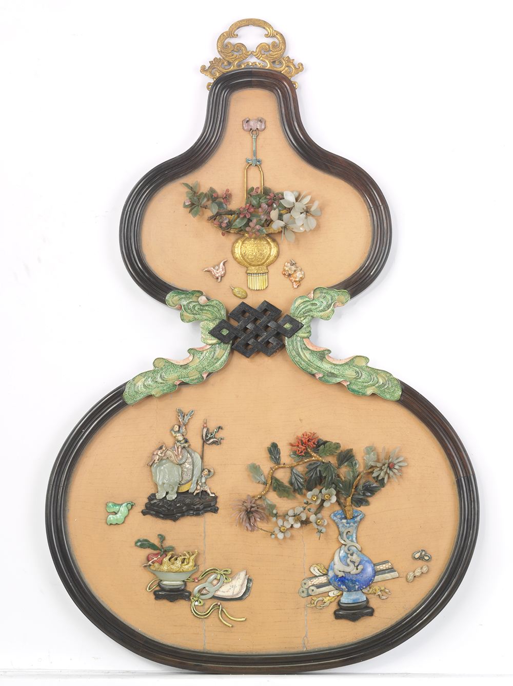 此挂屏以玉石镶嵌瓶花、佛手、书卷、太平有象等年节清供,又以葫芦形谐音“福禄”,表达美好寓意。