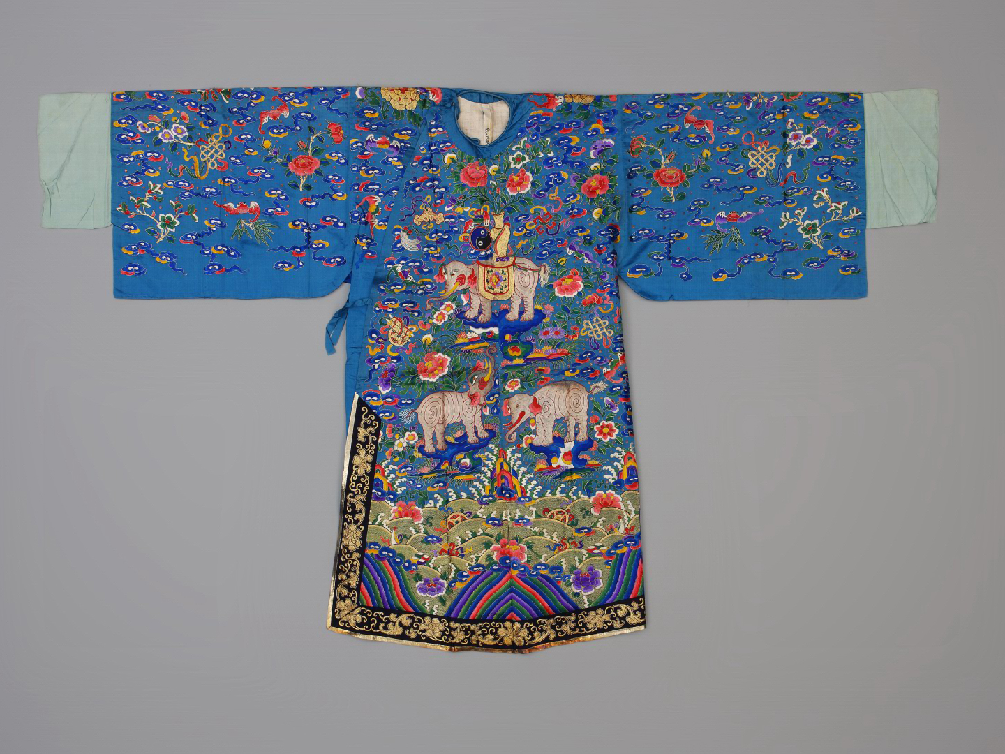 蟒通常以龙纹为主体纹饰,此蟒前身却绣太平有象纹,应为清宫节令戏所用,体现歌舞升平的盛世场景。