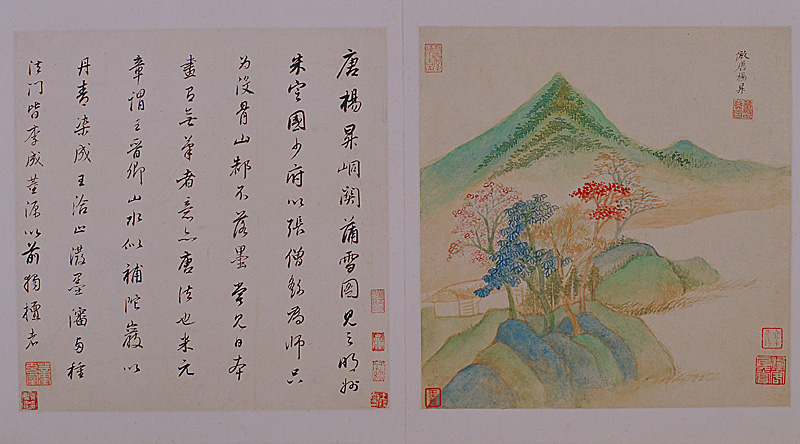 末开(仿李公麟山庄图)对开自题:“辛酉三月游武林,归途闲暇,作此八景。时画史杨彦冲同观,玄宰识。”附页有清潘遵祁、成沂题跋。此册钤“烟客真赏”(白文)“王时敏印”(白文)“王掞”(朱文)“虚斋至精之品”(朱文)等鉴藏印,经《虚斋名画录•续录》著录。