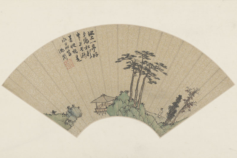 图绘高松江亭,一文士策杖而至。该图为扇面,在金笺纸上以青绿画山石,构图简洁,意境清幽。左上沈周自题:“池上一亭好,夕阳松影中,正无避暑地,认是水晶宫。沈周。”钤“启南”(朱文)印。