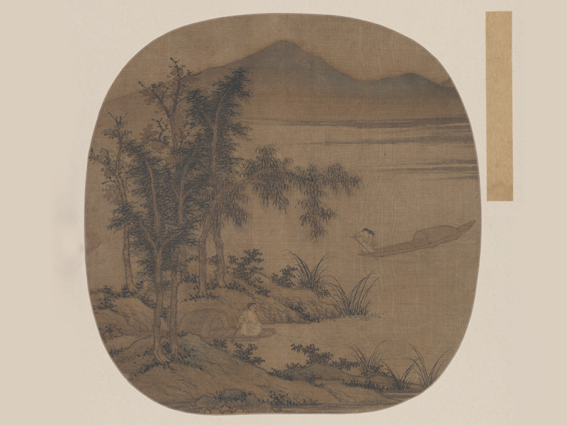 图绘一人悠然坐舟中,远处一童子划桨而来。山石以墨笔为主,近岸坡石及远山染以淡青绿色,墨色浑然交融。该图为纨扇装裱,表现渔人隐逸的主题,虽无作者款印,但是构图、笔墨均为盛懋的典型画风。