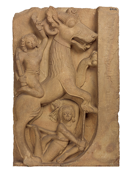 这尊雕像的题材来自《诃利世系》(Harivaṃśa)里记载的印度著名的克里希纳(Kriśna,意为黑色的神,也译为黑天)的神话故事。《诃利世系》是印度古代一部往世书类型的长诗,叙述了黑天的世系,被认为是崇拜黑天的经典,为艺术家的创作提供了无穷的素材来源。
