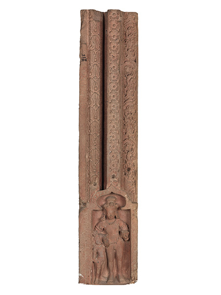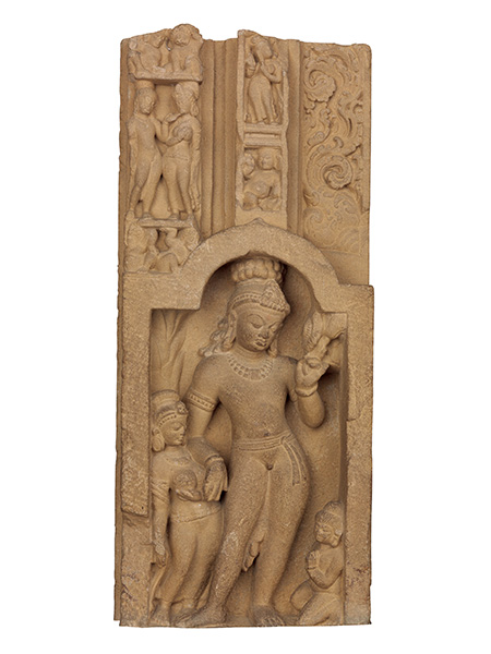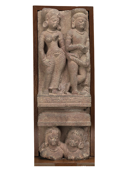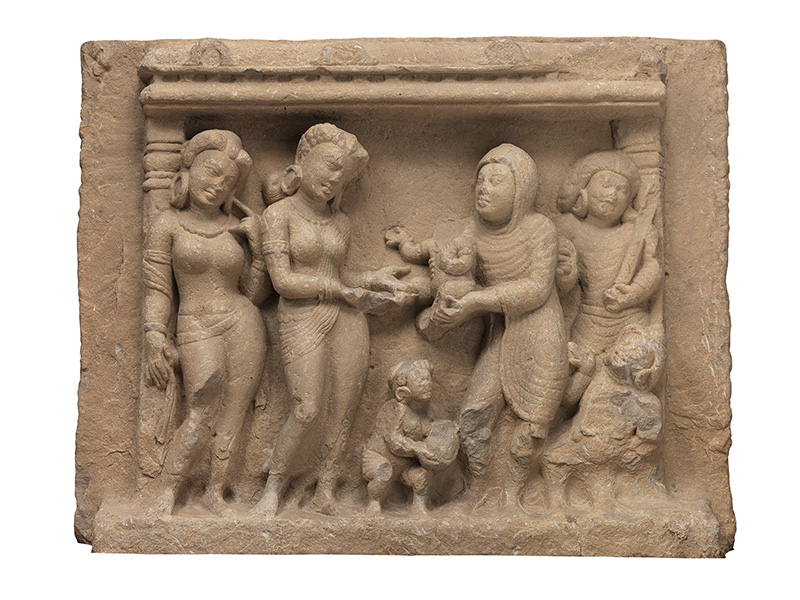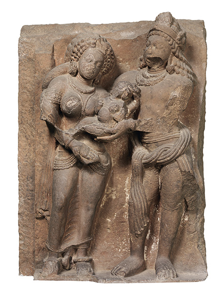 印度笈多时期,罗摩和克里希纳形式的毗湿奴崇拜非常流行。这尊雕像表现的就是提婆吉将刚诞下的婴儿克里希纳交给丈夫婆苏提婆送至狱外的场景。人物的雕刻具有笈多艺术的典型特点,女性健康丰满,男性结实健硕。提婆吉呈站姿,卷曲的头发盘在头顶,戴有耳环、项链、臂钏、腕饰、脚饰等,身穿薄透的印度沙丽,一手托着婴儿的头部,正在向丈夫递交。婆苏提婆上身袒露,下身穿的腰裙以阴线刻的形式表现,繁复的头饰和腰间系着的宽厚的腰带都具有笈多时期的特点。他正双手捧接妻子交给他的婴儿。