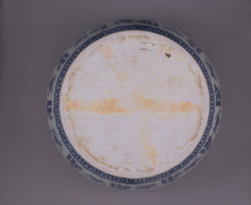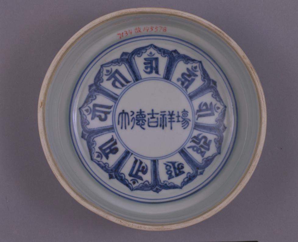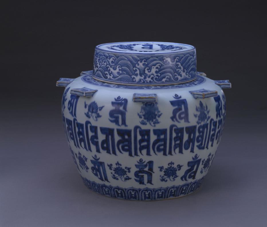 罐直口,短颈,平肩,鼓腹,下部微向内收,平底,肩部有个长方形平板出。外壁自上而下分层饰海水纹、八吉祥纹、蓝查体梵文和莲瓣纹等;内底双线圈外,九个莲瓣内各书写一梵文,双线圈内自左向右署篆体“大德吉祥场”款。
