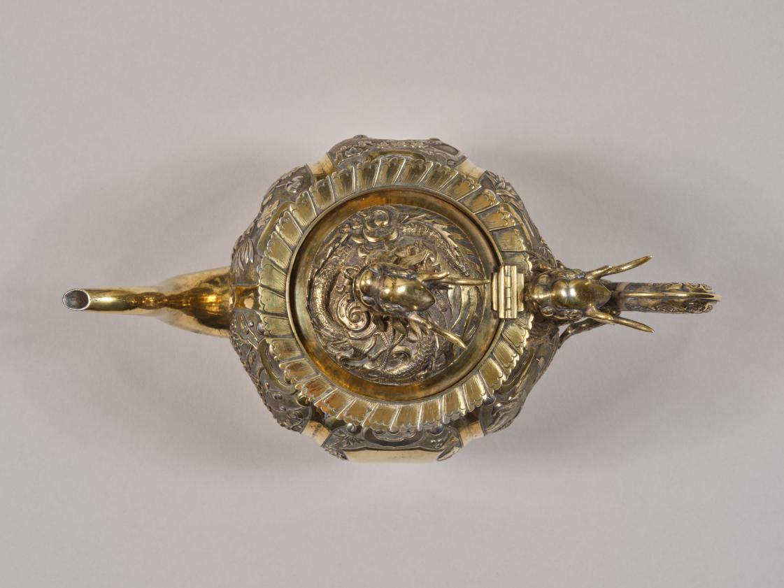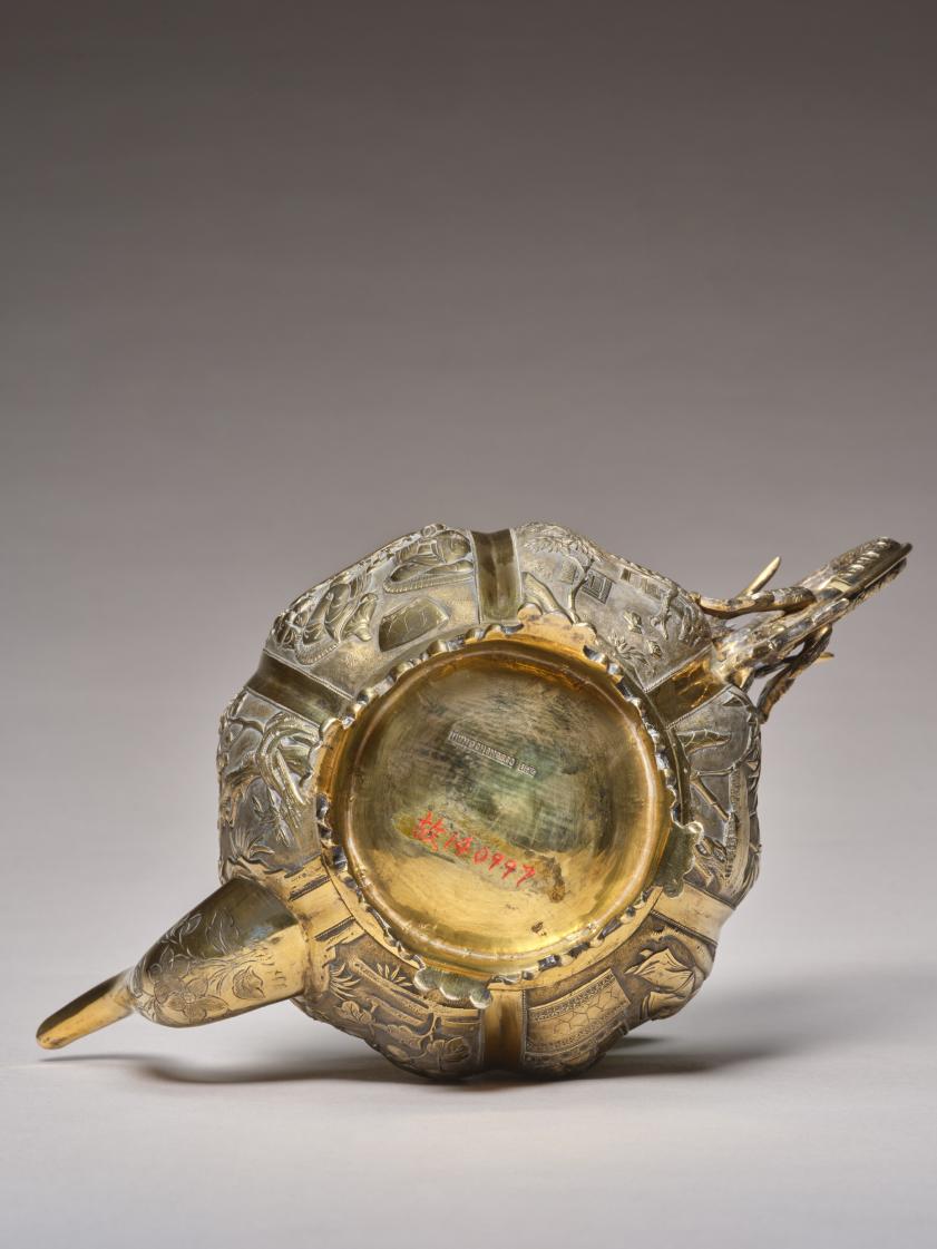 广州制西洋式银执壶。清代雍正、乾隆年间,西洋银器输入宫廷,清帝在把玩、使用的同时,亦命造办处仿制、创新,开发了许多艺术风格中西合璧的产品,此件银壶即为其中一例。