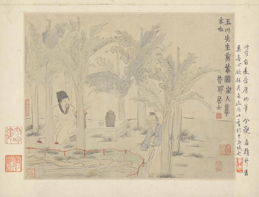 《玉川煎茶图页》表现了唐代著名诗人卢仝(音同)煎茶的场景。卢仝被世人称为茶仙,号玉川子,“玉川煎茶”是经久不衰的绘画题材之一。