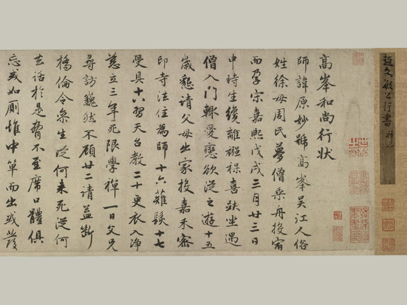 高峰和尚(1238—1295)是临济宗高僧,去世后由学生洪乔祖撰成《行状》,对其求法、传法等经历一一详述。高峰和尚门下名徒众多,其中中峰明本便是赵孟頫的佛学老师。此卷为赵孟頫壮岁所作长篇巨制,略少翩翩逸兴和婀娜矫健,然字字笔力遒劲而不乏姿媚,书写轻松自如,骨肉停匀,其间架用笔,应规合矩,笔法老到,首尾如一。