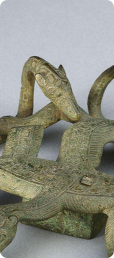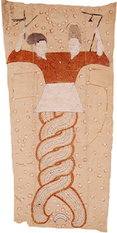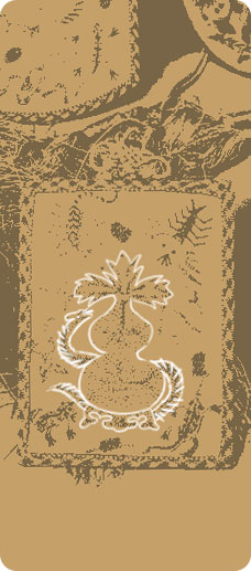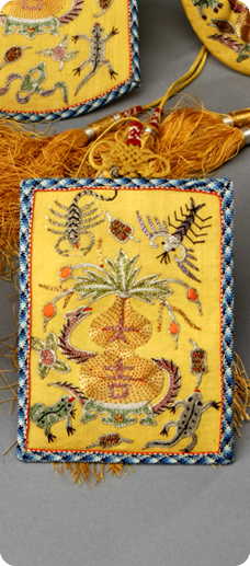 这套活计是端午节佩戴之物,共9件,其中荷包3件、烟荷包1件、表套1件、扇套1件、镜子1件、粉盒1件、名姓片套1件。每件的颜色和纹样相同,均为明黄色,通体以金线、银线和五彩丝线绣五毒和“大吉”葫芦纹。“五毒”为蛇、蟾蜍、蝎子、壁虎和蜈蚣五种有毒动物,配以“大吉”字样和葫芦纹样相组合,寓意以毒攻毒,以恶镇恶,驱邪免灾。