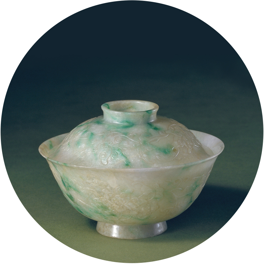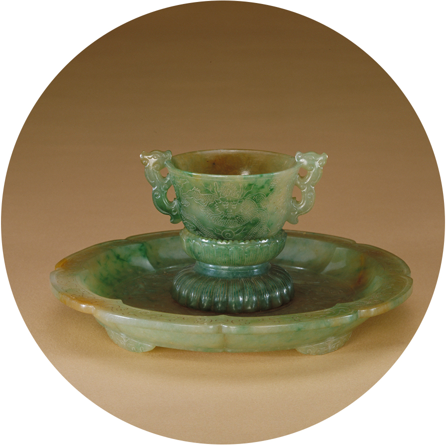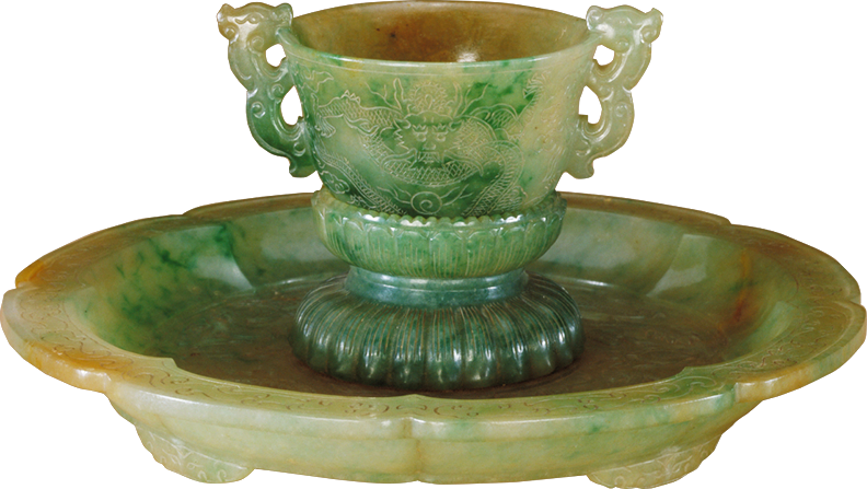 在清宫的翡翠日用品中,餐具占有重要位置,主要有杯、盘、碗、盒等。由于日用器具的器形较大,因而高翠作品较少。这些作品胎体薄而均匀,器表平整光滑,较少起伏,表面抛光较好,表现出翠料的质感。