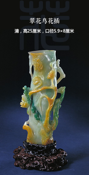 翠呈青绿色,局部有深绿及黄褐色。花插较高,呈树桩形,主杆粗大,内可插物。花插的外壁 镂雕牡丹花枝,枝上立着禽鸟。下配以镂空雕花红木座。