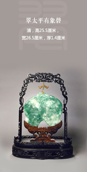 翠质优良,局部色较深。作品呈片状,依形琢线,呈大象形状。其中一面全身雕云纹,中部开光篆书“太平有象”四字。磬架为紫檀木质,透雕花叶纹。