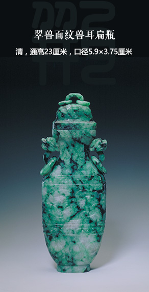 翠呈青绿色,局部色重,为墨绿色。瓶扁而高,盖面饰云纹,环式纽。瓶口沿饰回纹,颈较细,颈两侧以兽首为耳,耳下有活环。瓶腹较阔,两面饰兽面纹。