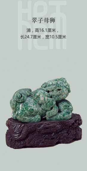 作品翠质以青绿色为主,兼有青白色斑,透光度较低。雕大、小双狮。大狮方头,阔嘴,回首状,狮尾多歧而卷曲,四肢卧于腹下,前肢抱球。小狮趴于大狮背上。作品配紫檀木座,近似椭圆形,饰有山石纹。