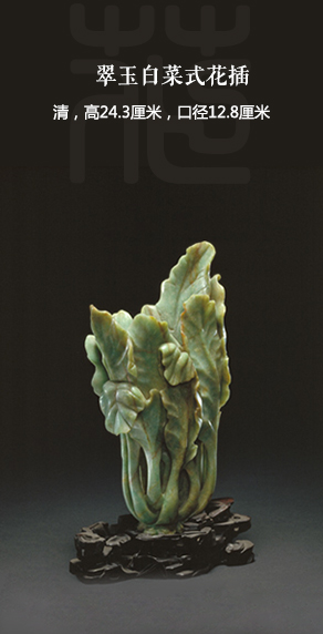 翠色青绿,透光性较弱。花插为白菜形,采用雕琢手法,上部菜叶相并,或高或低,亦有折而下垂者,环并一周,内空,可插物。下部叶梗直立,间有空隙。