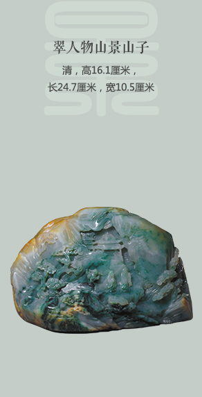 清代宫廷翡翠陈设品的设计与玉陈设品的设计目的、设计过程大致相同,受宫廷绘画的影响很大,甚至有很多宫廷画家直接参与,因此作品有较高的艺术水平,这一点在玉质图画作品、人物与动物作品以及常用的装饰图案上表现得尤其明显,例如在翠山子、翠插屏上,作品构图有主题,布局的层次、人物及景物的表现皆具绘画风格。动物作品的制作造型准确,由此可以看出作者的写生功底。清宫翡翠器中还有一些仿古作品,器皿多仿青铜器,如翠觚、翠炉一类,纹饰有兽面纹、蕉叶纹、夔龙纹等。这种仿古器多创作于清中期。