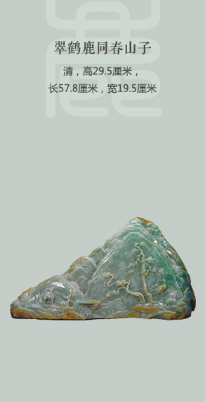 翠料局部呈青绿色,个别处翠色较深,用山料翠玉雕成,表面有染色。作品为山形,山上白云飘忽,泉水蜿蜒而下,小桥横跨溪流。一岸有古松两棵,松下双鹤,附近的竹丛以阴线刻就。另一岸为双鹿,一立一卧。此为传统的鹤鹿同春图案。山子背面雕简单的山石、树木图案,并有较重的染色。