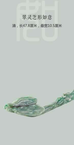翠质青绿。如意为灵芝形,柄作灵芝枝干,镂雕小枝及叶,并有小灵芝饰于柄下端。头部雕作灵芝形。