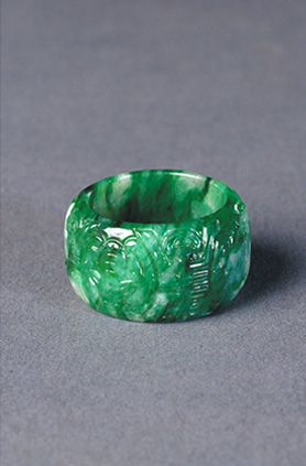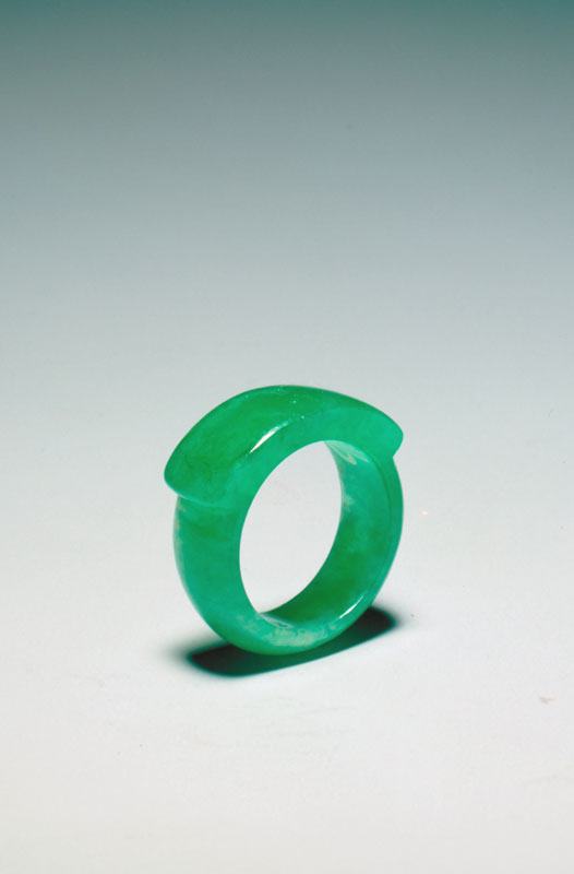 翠色全绿。戒指形状为马蹬形,上面呈弧形板状。属高档翠料。
