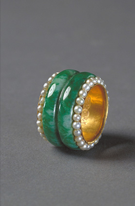 此戒指内部为金里,由薄金片制成,其外嵌翠环两周,素无纹饰,有天然的绿色纹理。戒指两圈口处各嵌珍珠一周。