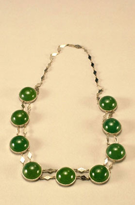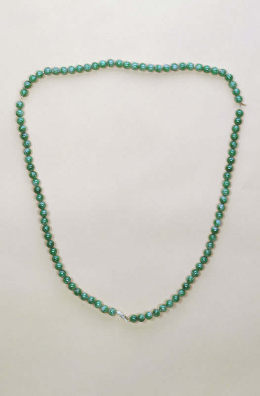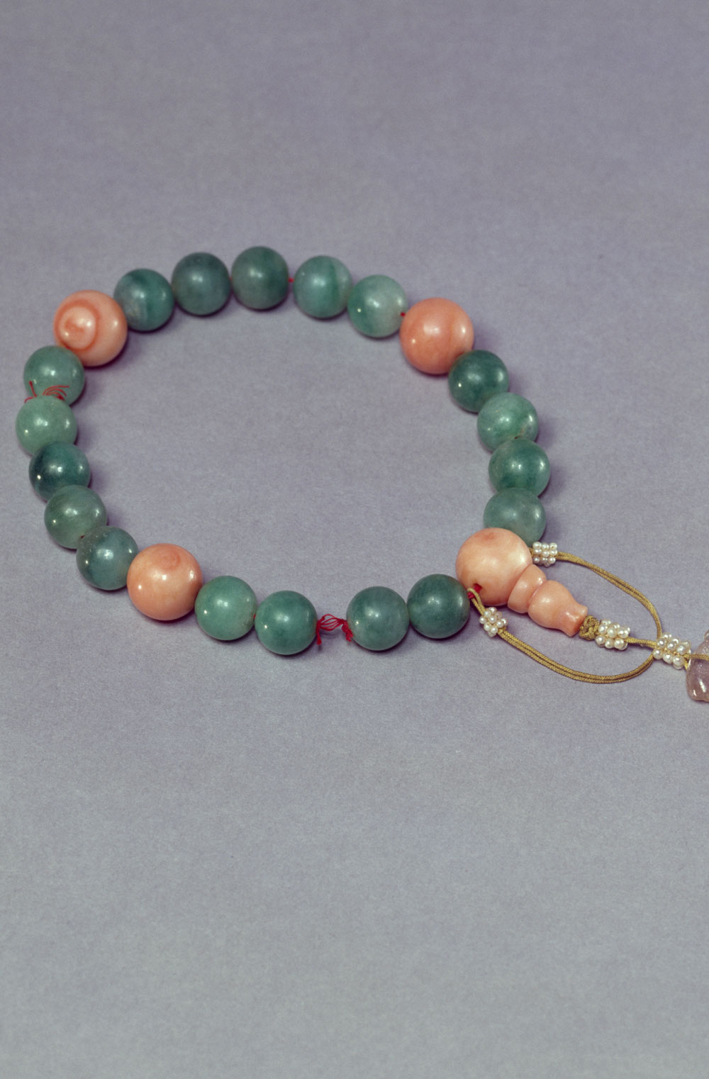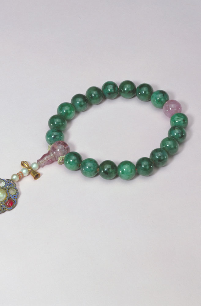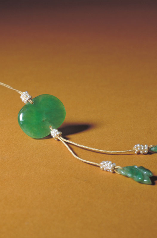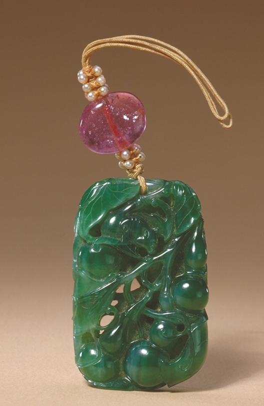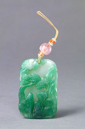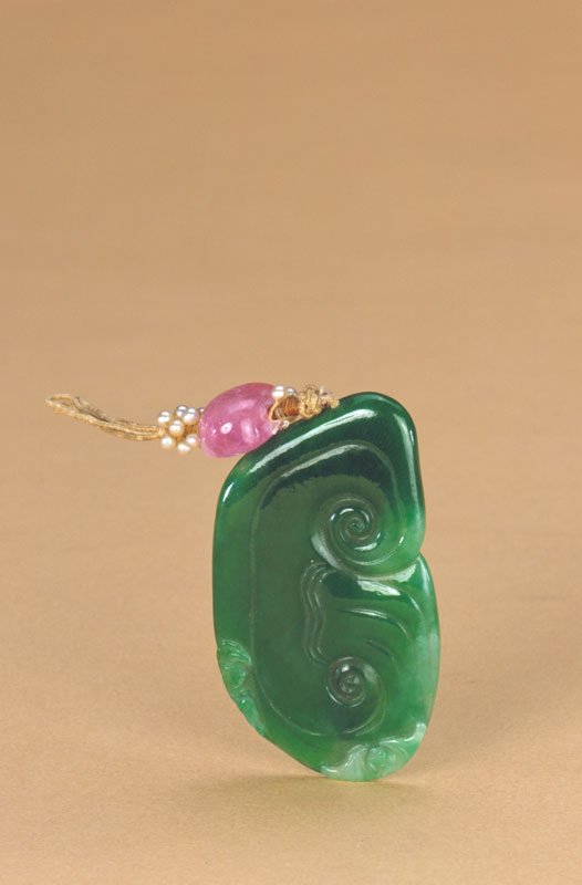 翠质呈绿色。佩为片状,体较厚,雕作灵芝样。上部有孔,穿有绦绳、米珠及粉红碧玺。