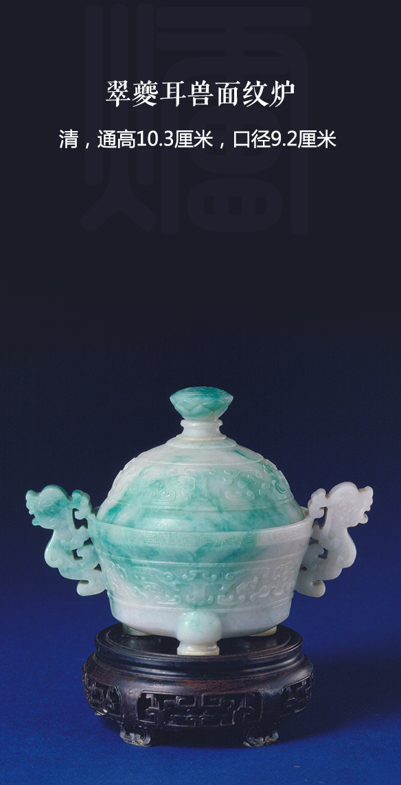 翠色青白,局部绿色。炉为圆形,壁较直,腹部饰凸起的兽面纹。炉身两侧有对称的夔式耳,夔形较扁,兽头,细身。炉盖较高,花蕾式钮,盖面饰兽面纹。炉下三矮足。