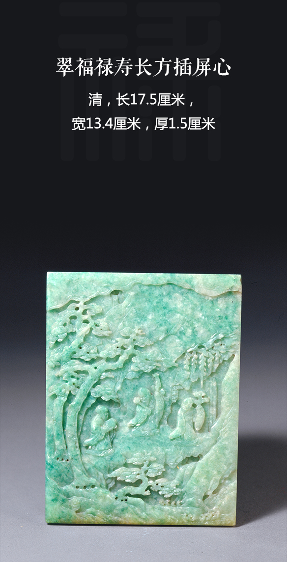 翠质青绿色。插屏心为长方形,片状。作品雕山林之景,山石现于作品边部,中间松树成林,松高叶茂,三老人散立于树下。
