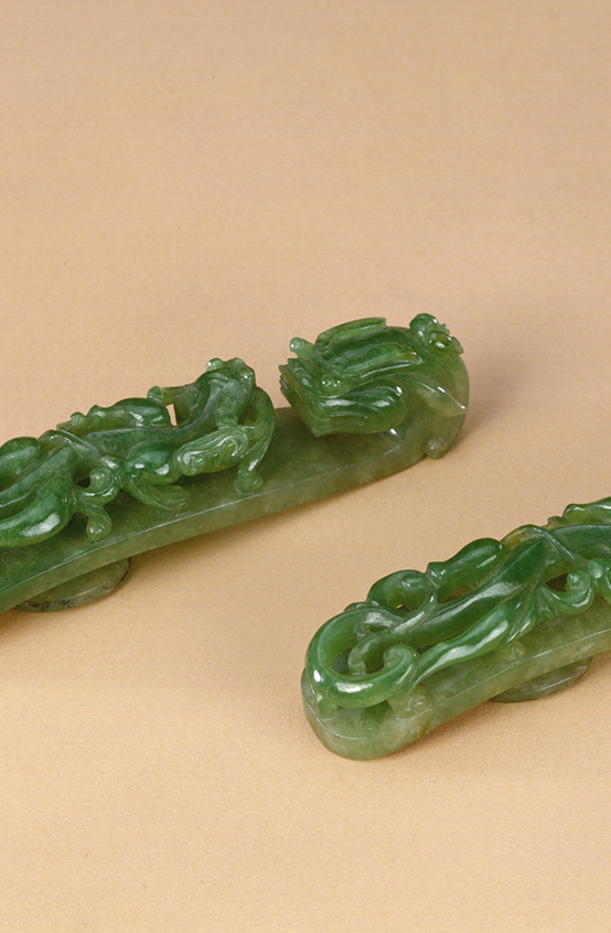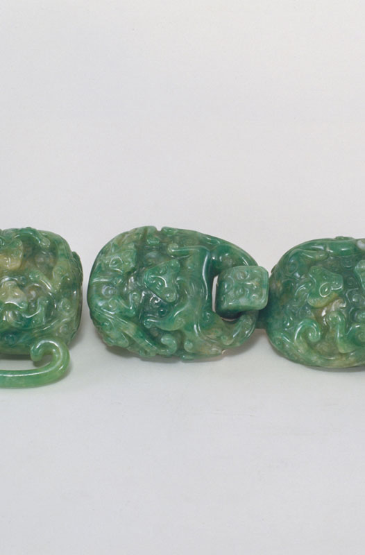 翠质为青绿色,局部绿色较重。作品四件一套,其中一件为带钩,一件为钩环,钩环与带钩钩合,用于腰带的端部。另两件可穿于带上,置于身体两侧,其下有环,可挂物,有些学者称其为“提携”。四件作品皆近于椭圆形,其上凸雕云螭纹。