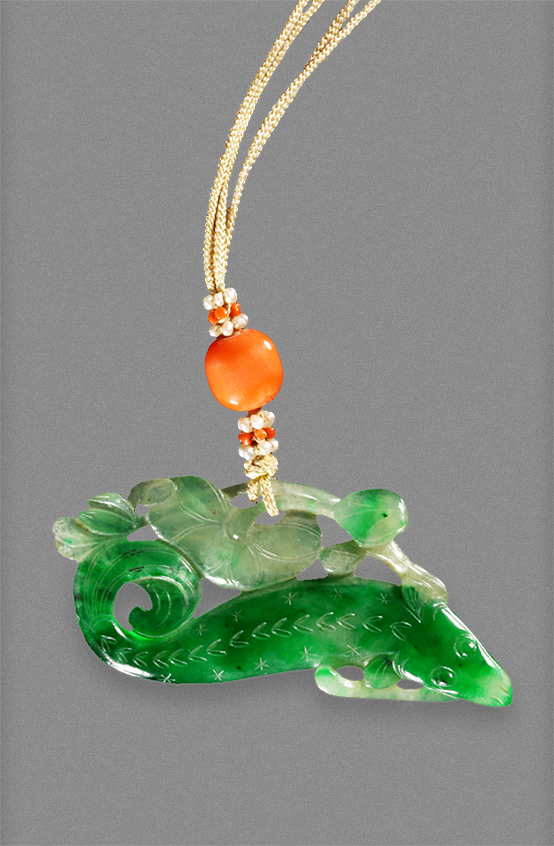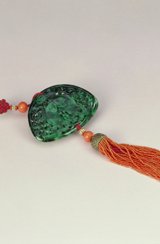 作品所用翠料为青、绿二色。青料上有绿斑,以之琢荷花、荷叶。荷之下的绿料琢为鱼,宽头,长身,卷尾,形似鲶鱼,如同在荷塘中游动。佩上系一枚珊瑚纽。