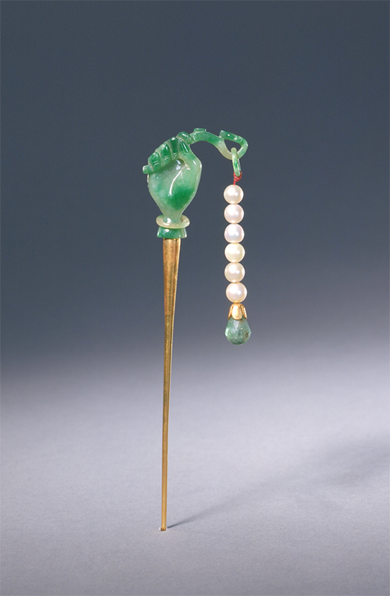 此簪金质,簪身细长。较粗的一端嵌接翠簪头,翠质青绿,局部为深绿色。簪头雕作一只手,腕戴白玉镯,五指握一翠如意,如意头勾回,套一翠活环,环下挂珍珠六粒、蓝晶坠角一个。