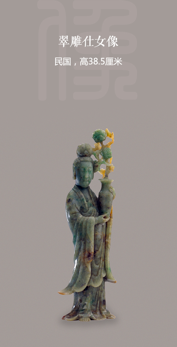翠色略暗。仕女为立姿,着长裙,衣袖下垂飘逸。双手持一瓶,右手托瓶底,左手抱瓶颈,瓶中插花一枝。