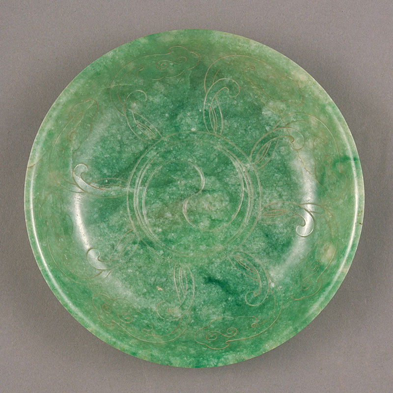 螭纹是中国古代工艺品中常见的装饰,清代宫廷用品上往往以螭纹表示龙,此物之螭纹也呈龙的形象。所用翠料透明度高,绿色呈斑状,分布均匀,质地优良。