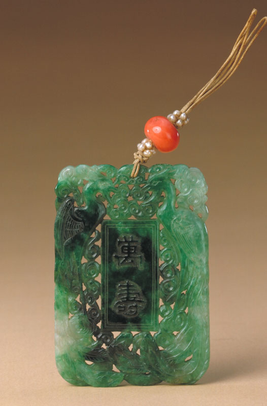 翠牌长方形,牌体较厚。两面均镂雕双凤相对,凤身下镂雕花卉、朵云纹为地。两面双凤之间分别凸雕“万寿”、“无疆”二字。佩上有系绳,绳上穿有红珊瑚珠。