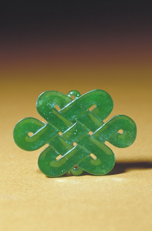 翠色绿且均匀,透光性强。坠呈片状,镂雕为盘肠形,上、下有小孔,可穿细绳。