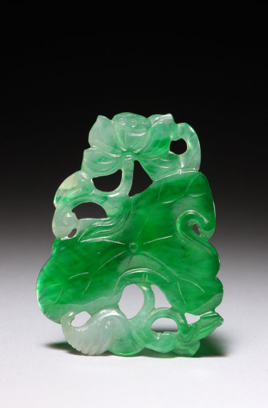 翠色青绿,局部色较重。坠为片状。颜色最重的中部镂雕荷叶,三歧状,边缘上卷,表面以阴线刻叶之脉络。荷叶上下的浅色处分刻荷梗、莲花及根部。作者在有限的范围内将整枝莲表现出来,造型鲜活,色彩富有层次。